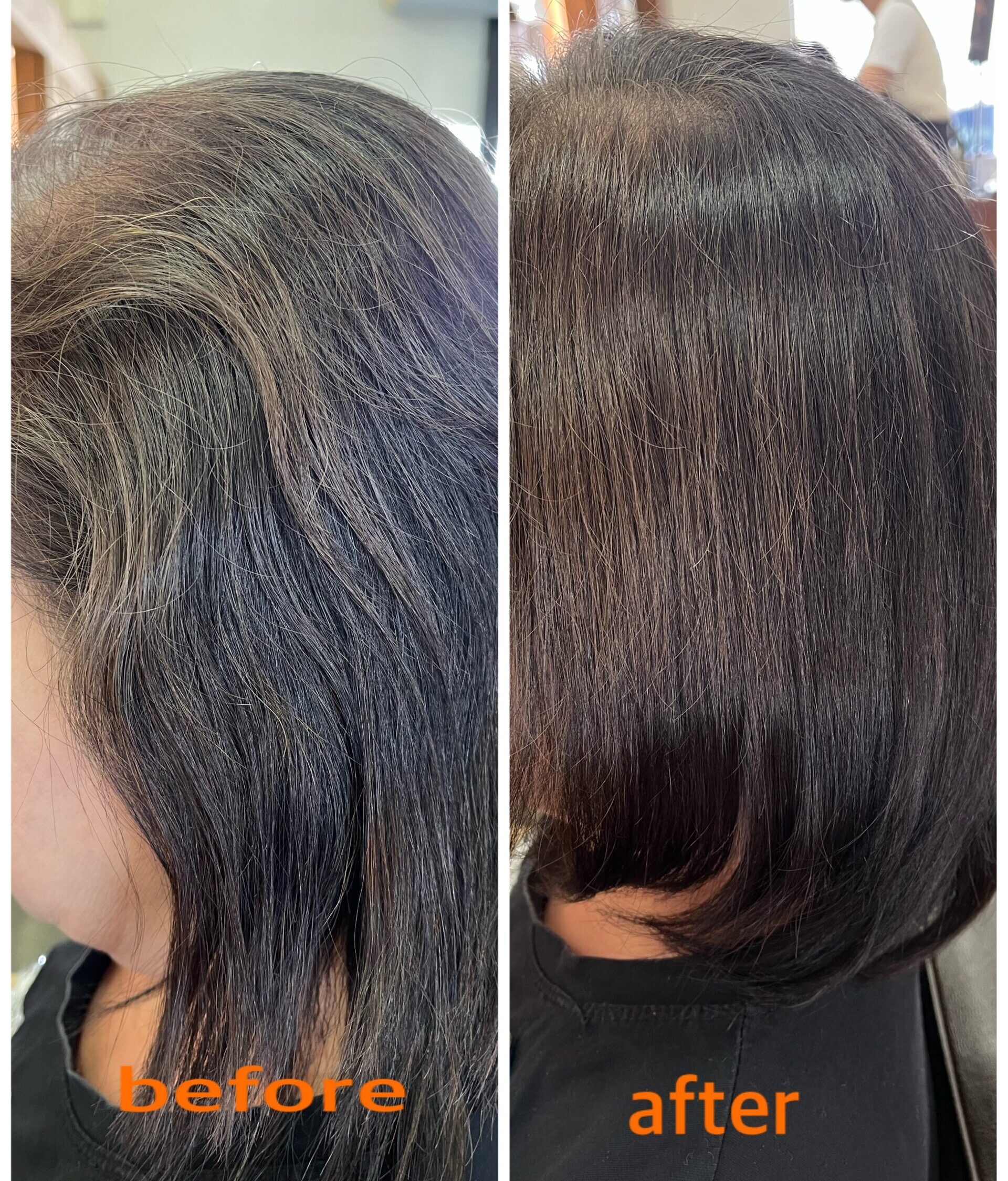 こちらのお客様は他店で白髪染めをされた結果、薬剤が髪にあっていなくて傷みで乾燥しパサつきや広がりをどうすることも出来ず、お客様の紹介で来店されました。髪は細く、柔らかくデリケート、今までもカラー時には頭皮がしみていたそうです。そんな悩みを解決する安心安全なTKのオリジナルの髪質改善ハーブトリートメントカラー。