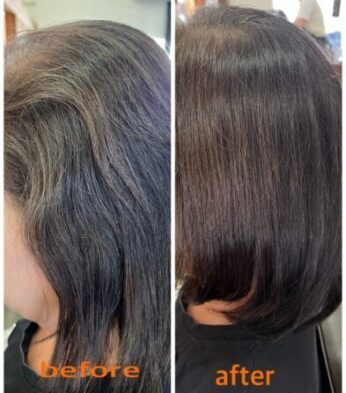 こちらのお客様は他店で白髪染めをされた結果、薬剤が髪にあっていなくて傷みで乾燥しパサつきや広がりをどうすることも出来ず、お客様の紹介で来店されました。髪は細く、柔らかくデリケート、今までもカラー時には頭皮がしみていたそうです。そんな悩みを解決する安心安全なTKのオリジナルの髪質改善ハーブトリートメントカラー。
